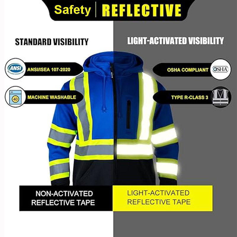 +Hi vis hoodies are specifically designed with high-visibility reflective materials and fluorescent colors (typically safety orange, lime yellow, or red) to meet safety standards like ANSI/ISEA 107. Unlike regular hoodies, they feature: